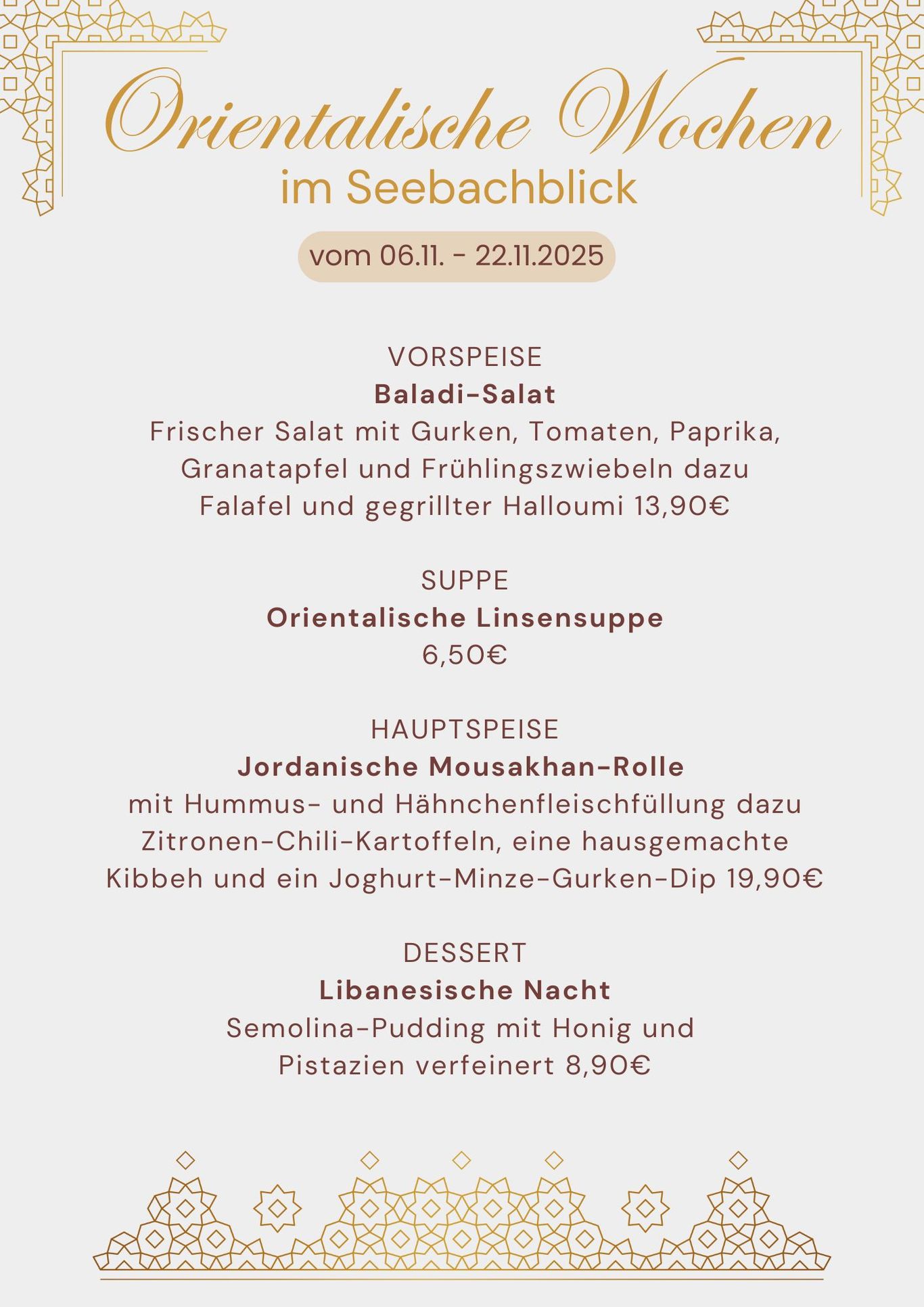 Zusätzlich zu unserer normalen Speisekarte haben wir aktuell diese leckeren, orientalischen Spezialitäten für euch! Nur erhältlich vom 06.11.-22.11.2025!